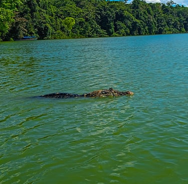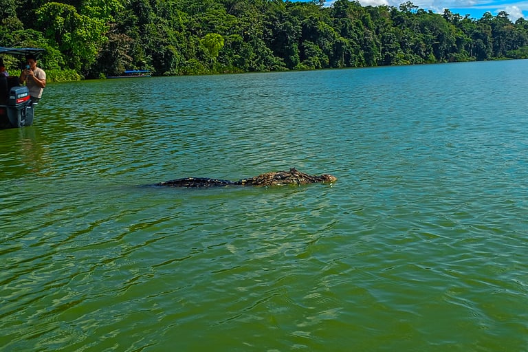 Continuing downstream, our task will be to search for the top predator of the Limoncocha Biological Reserve, the black caiman (Melanosuchus niger). This species can grow to between 3 and 7 meters in length. Its usual diet includes all kinds of mammals and birds, helping to control the animal populations in the reserve.